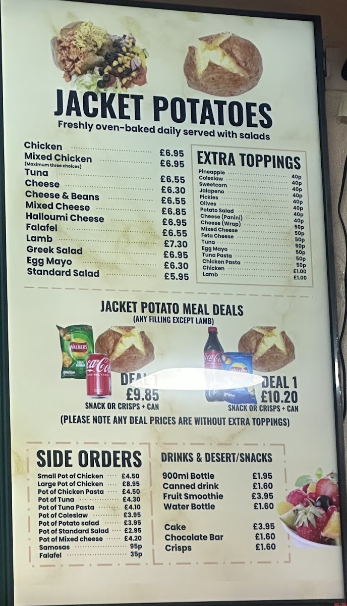 - Jacket Potatoes: Featuring fillings such as chicken, these serve as a hearty option for a light lunch or snack.